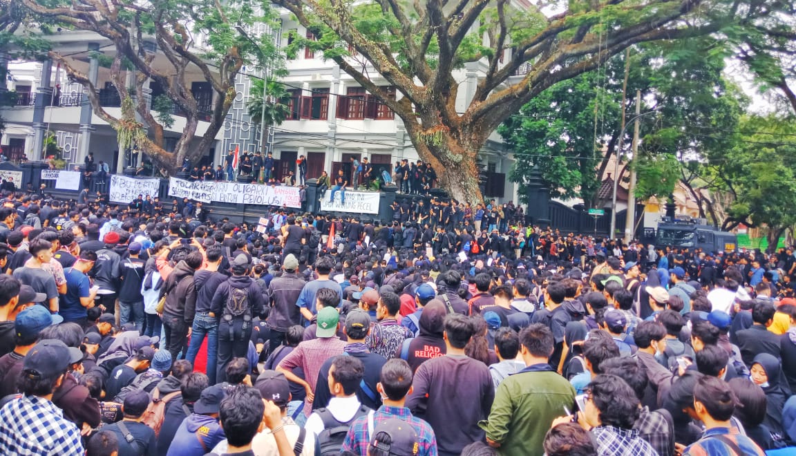 Ribuan mahasiswa Malang menggelar aksi menolak RKUHP dan kebijakan-kebijakan lainnya dari anggota dewan yang tidak pro rakyat di depan kantor DPRD Kota Malang, Senin (23/9/2019). (ABDULLAH/INDOTRIBUN.ID)